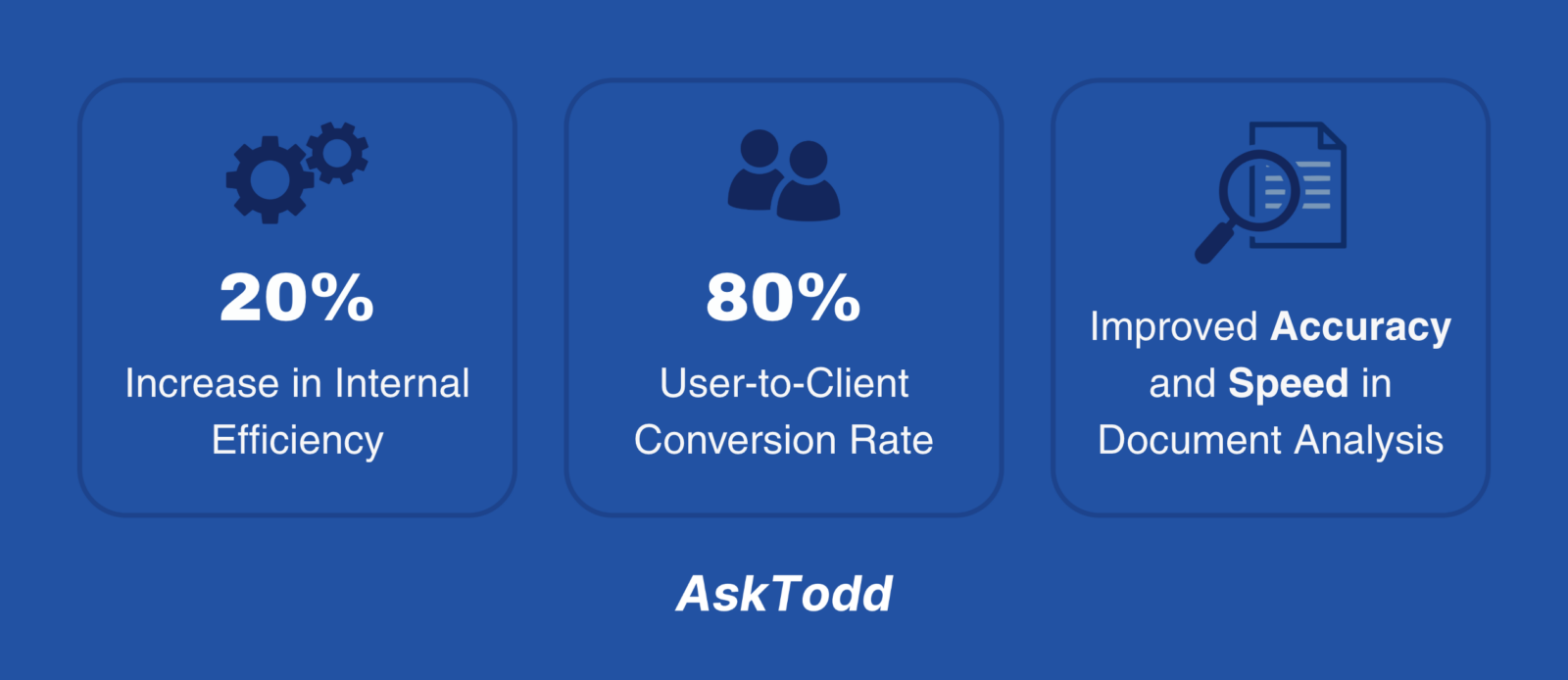 Overall, AskTodd improved the speed and accuracy of document analysis by delivering more precise, context-aware insights that legal teams could act on quickly.